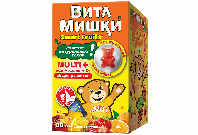 ВитаМишки® Multi + йод + холин – сбалансированный витаминно-минеральный комплекс в виде вкусных мармеладных пастилок мишек с натуральными фруктовыми и овощными экстрактами для детей с 3-х лет.