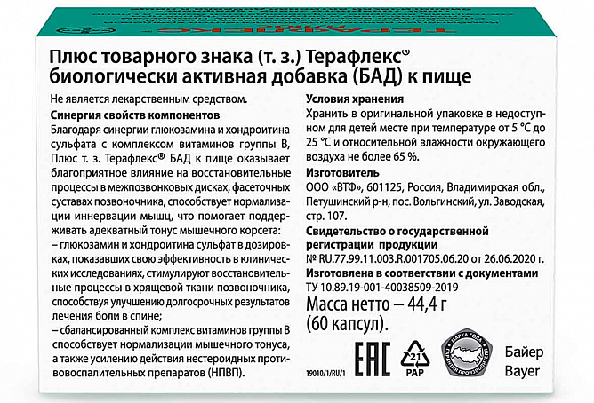 Глюкозамин усиливает синтез коллагена II типа, хондроитина сульфата и гиалуроновой кислоты. Хондроитина сульфат оказывает анальгетическое и противовоспалительное действие, способствует активной регенерации хряща.