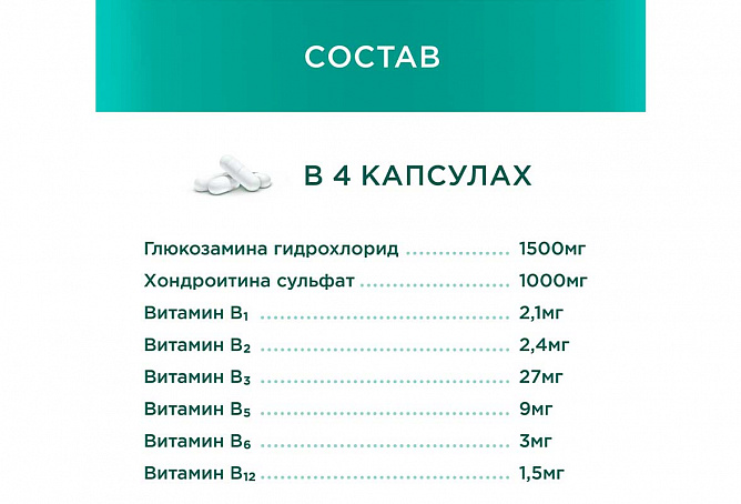 Глюкозамин усиливает синтез коллагена II типа, хондроитина сульфата и гиалуроновой кислоты. Хондроитина сульфат оказывает анальгетическое и противовоспалительное действие, способствует активной регенерации хряща.