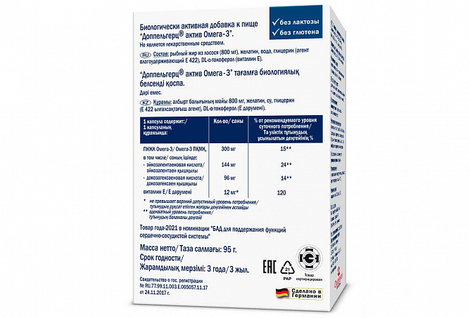 Доппельгерц актив Омега - 3 содержит натуральные полиненасыщенные жирные кислоты Омега - 3 из лососевых рыб и витамин Е для снижения риска развития сердечно-сосудистых заболеваний, в том числе атеросклероза.