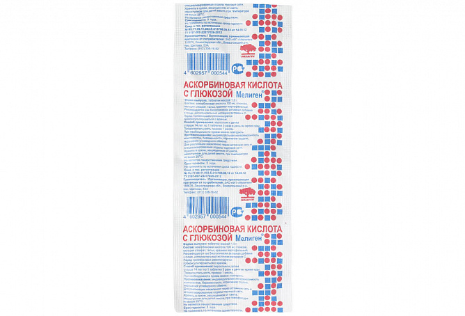 Глюкоза, аскорбиновая кислота 100 мг, кальция стеарат, тальк, крахмал картофельный.