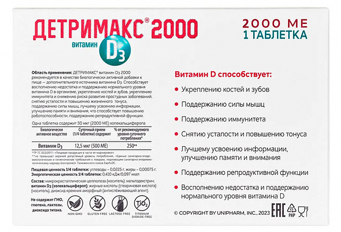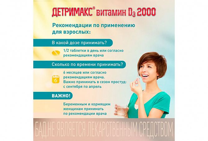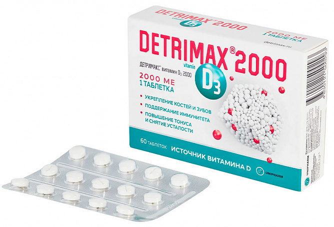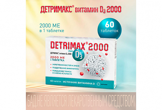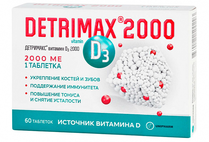 ДЕТРИМАКС® витамин D3 2000 рекомендуется в качестве биологически активной добавки к пище — дополнительного источника витамина D3. Способствует восполнению недостатка и поддержанию нормального уровня витамина D в организме, укреплению костей и зубов, укреплению иммунитета и снижению риска развития простудных заболеваний, снятию усталости и повышению жизненного тонуса, поддержанию силы мышц, лучшему усвоению информации, улучшению памяти и внимания, что способствует повышению работоспособности, поддержанию репродуктивной функции.