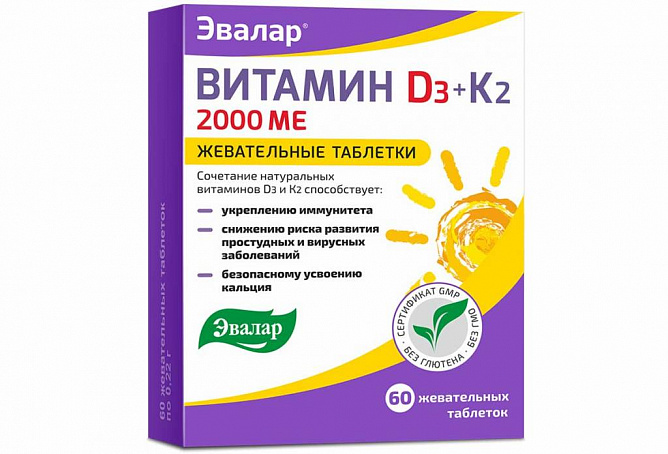 В жевательных таблетках Витамин Д3 2000 МЕ + К2от компании «Эвалар» натуральный витамин D3 с высокой дозировкой усилен натуральным витамином К2 в самой биодоступной форме МК-7. К2 дополняет действие витамина D тем и помогает ему лучше усваиваться организмом. Это единственный в России витамин D3 с высокой дозировкой, усиленный витамином К22.А за счет удобной формы жевательных таблеток Витамин Д3 2000 МЕ + К2от «Эвалар» усваивается еще лучше.
