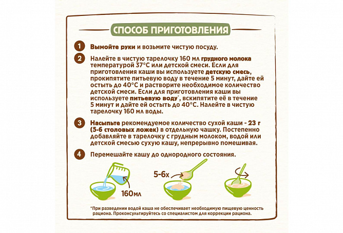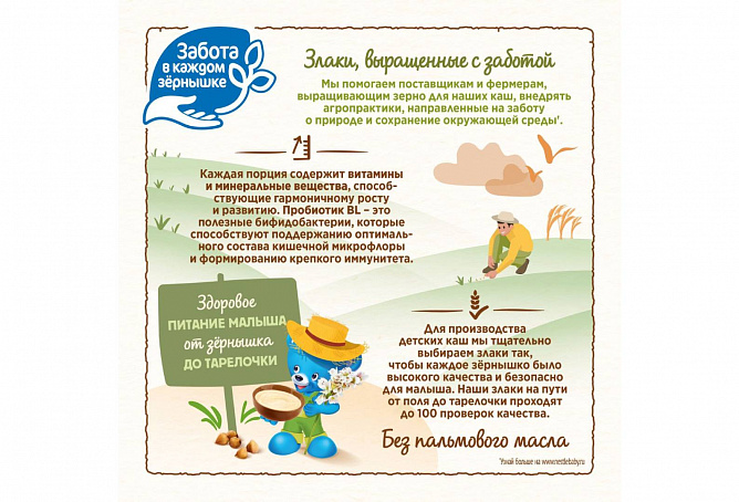 В каждой порции содержится комплекс витаминов и минеральных веществ для здорового роста и развития. Каша не содержит добавленного сахара, что способствует формированию правильных привычек питания и заботе о здоровье малыша с раннего возраста. Без пальмового масла.