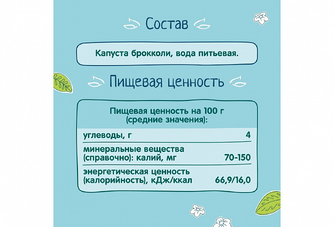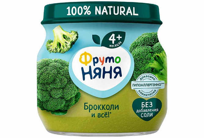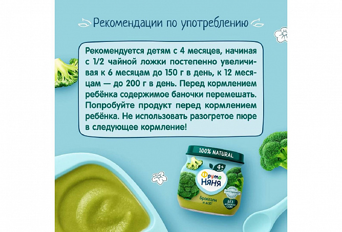 Пюре из брокколи рекомендуется детям с 4 месяцев, начиная с 1/2 чайной ложки, постепенно увеличивая к 6 месяцам до 150 г в день, к 12 месяцам — до 200 г в день. Перед кормлением ребенка содержимое баночки перемешать.