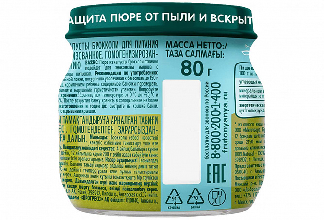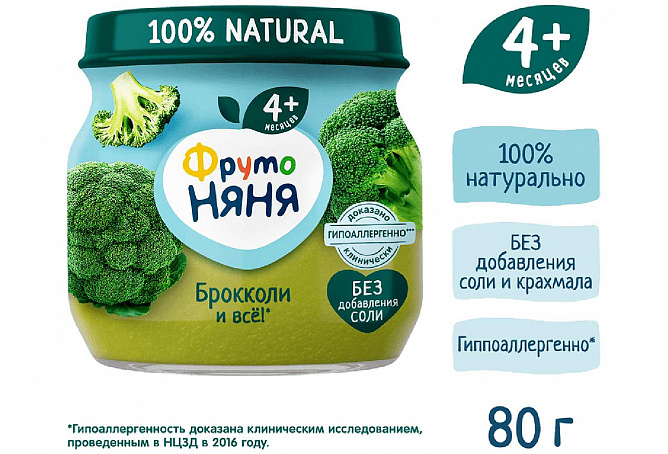 Пюре из брокколи «ФрутоНяня» имеет идеальный состав, чтобы начать самые первые шаги к прикорму малыша. В составе только капуста брокколи, благодаря которой малыш может познакомиться поближе с первым прикормом начиная уже с 4 месяцев. Так просто расширить рацион крохи и подарить ему новые впечатления от вкуса с «ФрутоНяней», где есть только отборные овощи, чистая питьевая вода и нет консервантов, красителей и соли! Гипоаллергенность доказана клинически.