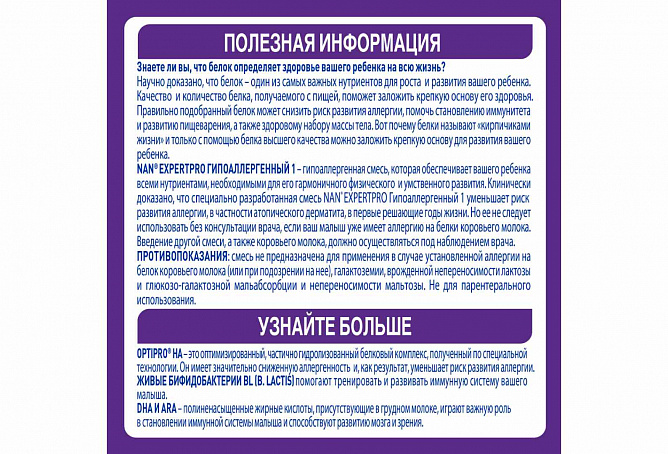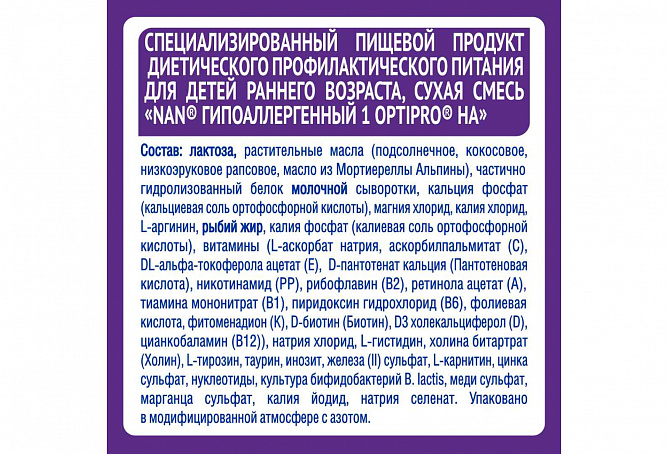 Клинически доказано, что специально разработанная смесь NAN® Гипоаллергенный 1 OPTIPRO®HA уменьшает риск развития аллергии, в частности атопического дерматита, в первые решающие годы жизни. Однако ее не следует использовать без консультации врача, если ваш малыш уже имеет аллергию на белки коровьего молока. Введение другой смеси, а также коровьего молока, должно применяться под наблюдением медицинского работника.