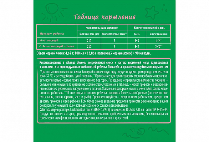 Руководствуясь таблицей кормления, налейте в бутылочку точно отмеренное количество теплой воды. Перед использованием мерной ложки, находящейся в упаковке, необходимо тщательно ее вымыть и полностью высушить. Для приготовления используйте только мерную ложку, заполненную без горки. Руководствуясь таблицей кормления, добавьте точное количество мерных ложек сухого порошка в соответствии с возрастом вашего ребенка.