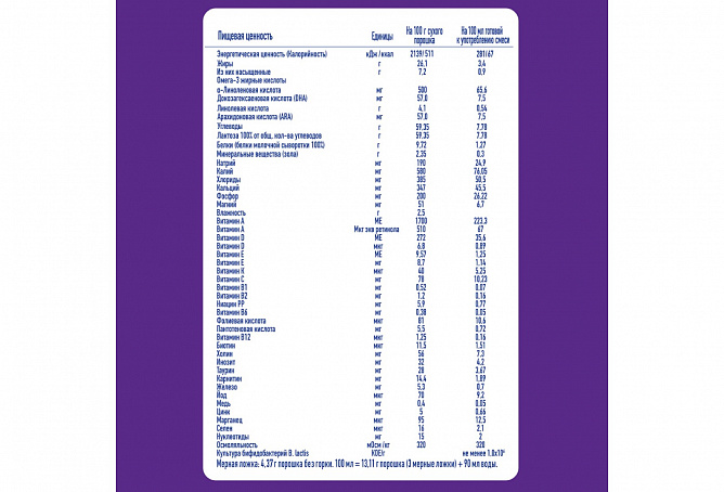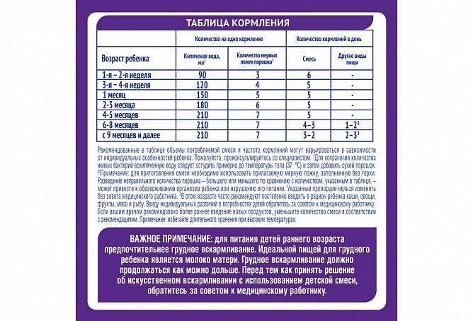 Точно следуйте инструкции по приготовлению. Разведение неправильного количества порошка — большего или меньшего по сравнению с количеством, указанным в таблице — может привести к обезвоживанию организма ребёнка или нарушению его питания. Указанные пропорции нельзя изменять без совета медицинского работника. В этом возрасте часто рекомендуют постепенно вводить в рацион ребенка каши, овощи, фрукты, мясо и рыбу. Ввиду индивидуальных различий в потребностях детей обратитесь за советом к медицинскому работнику. Если вашим врачом рекомендовано более раннее введение новых продуктов, уменьшите количество смеси в соответствии с рекомендациями.