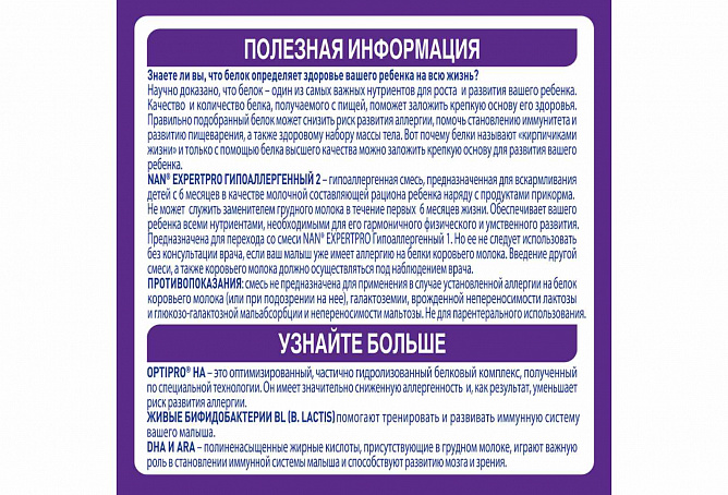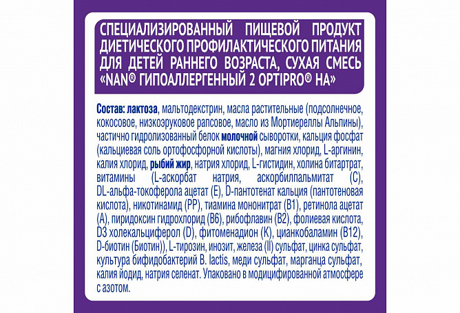 Смесь NAN®Гипоаллергенный 2 OPTIPRO® HA специально предназначена для перехода со смеси специально предназначена для перехода со смеси. Однако ее не следует использовать без консультации врача, если ваш малыш уже имеет аллергию на белки коровьего молока. Введение другой смеси, а также коровьего молока, должно применяться под наблюдением медицинского работника.