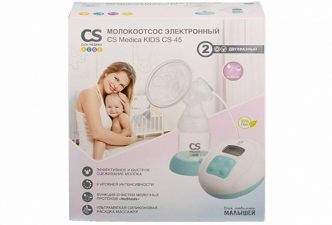 Молокоотсос CS Medica KIDS CS-45 с электронной системой управления разработан в помощь кормящим мамам. Отличительная особенность прибора – технология двухфазного сцеживания, которая воспроизводит естественный ритм сосания ребенком материнской груди и позволяет провести быстрое и бережное сцеживание.