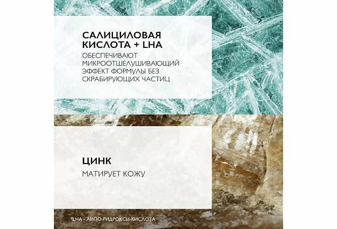 2% [САЛИЦИЛОВАЯ КИСЛОТА] + [ЛИПО-ГИДРОКСИ-КИСЛОТА– LHA] обеспечивают микроотшелушивающий эффект формулы без скрабирующих частиц