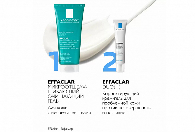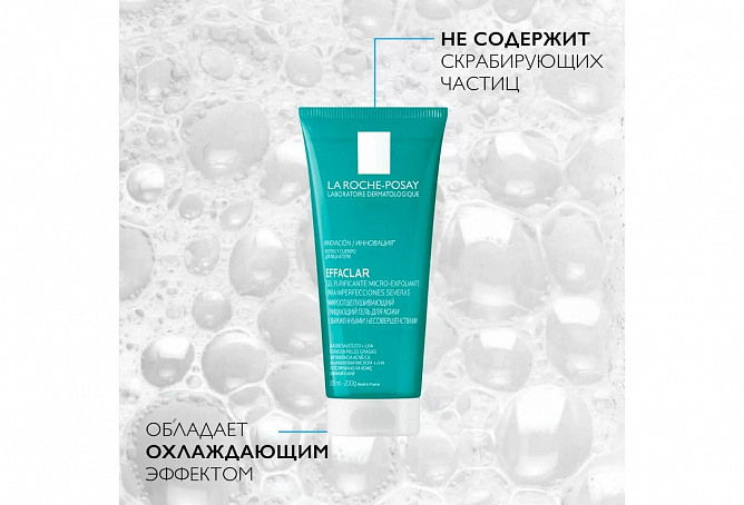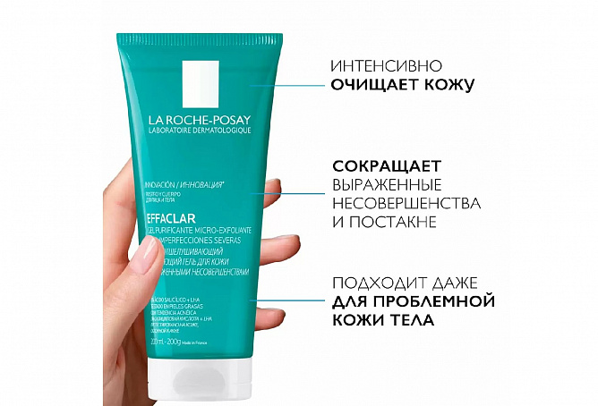 МИКРООТШЕЛУШИВАЮЩИЙ ГЕЛЬ EFFACLAR интенсивно очищает кожу и поры от загрязнений, сокращает несовершенства, удаляет избыток кожного сала, оставляя кожу заметно более чистой и свежей. Формула с салициловой и липо-гидрокси-кислотой (LHA) обеспечивает микроотшелушивающий эффект без трения и скрабирующих частиц в составе ИНТЕНСИВНАЯ ФОРМУЛА ГЕЛЯ ПОДХОДИТ ДАЖЕ ДЛЯ ПРОБЛЕМНОЙ КОЖИ ТЕЛА. Клинически доказанная эффективность против повторного появления несовершенств.