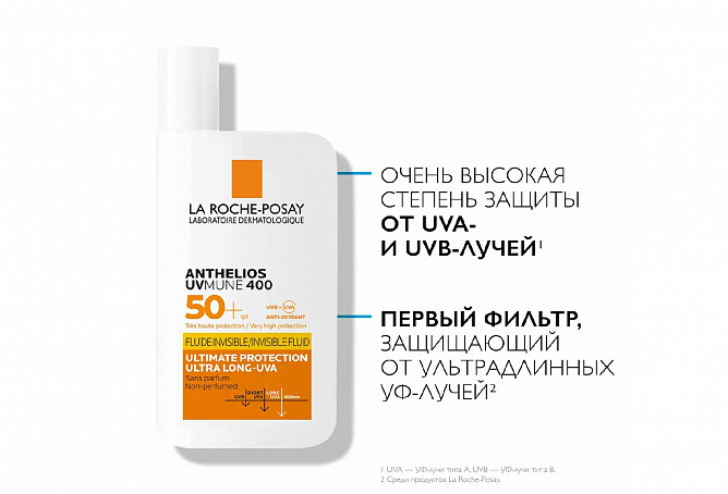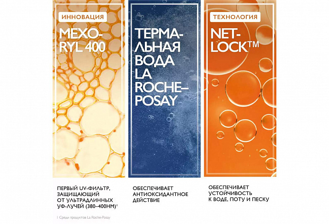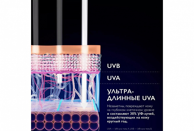 Защита от широкого спектра УФ-лучей: UVB-, UVA- и ультрадлинных UVA-лучей. Инновационный UV-фильтр Mexoryl 400 защищает от ультрадлинных UVA-лучей (380-400 нм) которые незаметны, повреждают кожу на глубоком клеточном уровне и составляют 30% УФ-лучей, воздействующих на кожу круглый год.