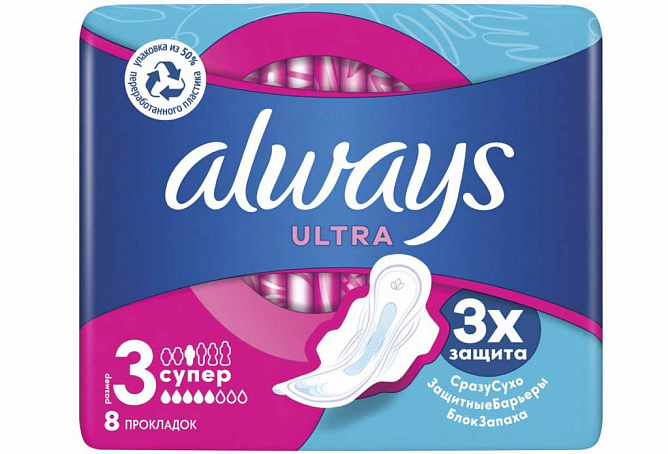 Тройная защита от Always — не соглашайтесь на меньшее: в Always Ultra «Супер» (Размер 3) с крылышками используется новейшая технология для создания многофункциональной гигиенической прокладки с 3 элементами защиты. Система «Сразу сухо» впитывает влагу за считаные секунды и не дает ей соприкасаться с кожей. Технология «Защитные барьеры» удерживает жидкость, предотвращая протекания. Технология «Блок запаха» нейтрализует неприятные запахи, придавая ощущение свежести и чистоты во время менструации. С Always Ultra вы можете чувствовать себя уверенно весь день. Тройная защита от Always — не соглашайтесь на меньшее. Формула дерматологически одобрена Ассоциацией здоровья кожи (Skin Health Alliance).