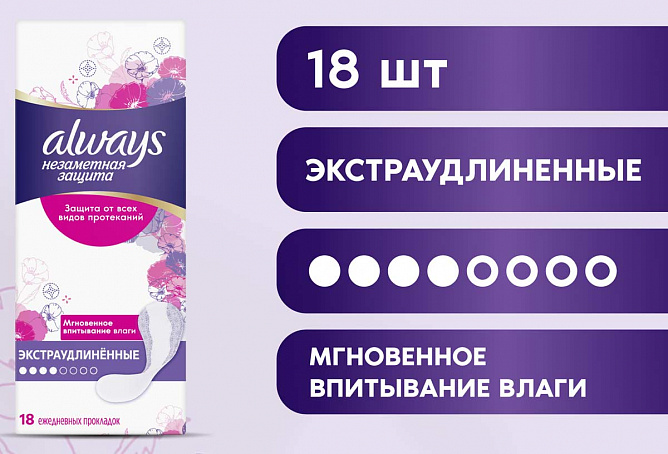 Их технология нейтрализации запаха дарит непревзойденную свежесть и обеспечивает чувство уверенности. Ежедневные гигиенические прокладки Always Незаметная Защита — отличное средство защиты при всех видах выделений.