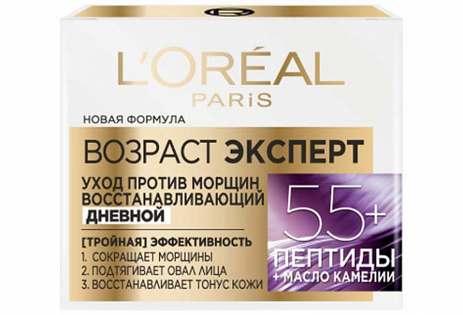 Дневной антивозрастной крем Возраст Эксперт 55+ одновременно действует в трёх направлениях: