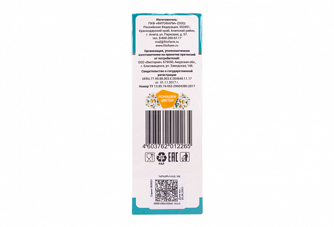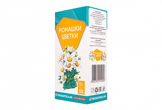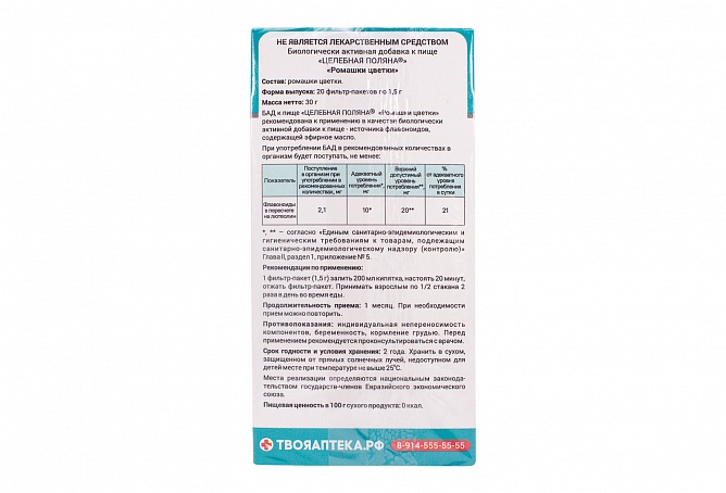 БАД к пище «Ромашки цветки» рекомендована к применению в качестве биологически активной добавки к пище – источника флавоноидов, содержащей эфирное масло.