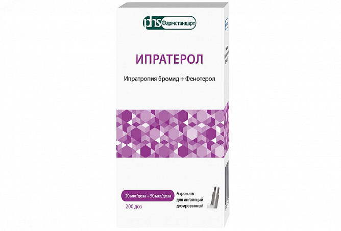 Ипратерол - лекарственное средство в виде аэрозоля для ингаляции. Оно предназначено для лечения бронхиальной астмы и хронической обструктивной болезни легких. Ипратерол содержит ипратропия бромид 20 мкг/доза и фенотерола гидробромид 50 мкг/доза. В баллоне - 200 доз препарата. Ипратерол обладает бронхолитическим действием, т.е. расширяет дыхательные пути и улучшает дыхание больного. Лекарство рекомендуется принимать только по назначению врача, соблюдая все инструкции и дозировку.