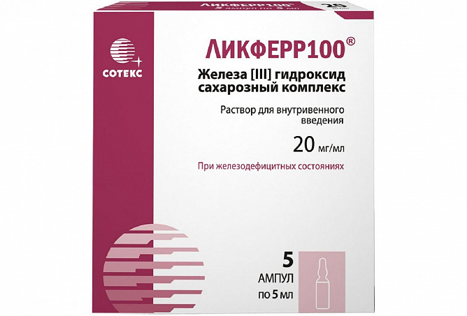 Активный компонент препарата Ликферр100® — железо-сахарозный комплекс — состоит из ядра многоядерного гидроксида железа (III), окруженного большим количеством нековалентно связанных молекул сахарозы. Средняя молекулярная масса этого комплекса примерно равна 43 кДа. Структура многоядерного железосодержащего ядра сходна со структурой ядра белка ферритина — физиологического депо железа. Этот комплекс предназначен для создания управляемого источника утилизируемого железа для белков, отвечающих за транспорт и депонирование железа в организме (соответственно трансферрина и ферритина).