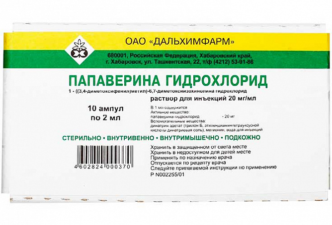 В 1 мл раствора для инъекций содержится активное вещество: папаверина гидрохлорид 20 мг.