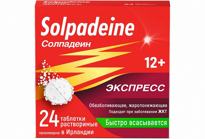Солпадеин Экспресс таблетки растворимые, №24 — обезболивающее средство ускоренного всасывания для облегчения болевого синдрома слабой и умеренной интенсивности, в том числе таких видов боли, как головная, зубная, мигрень и другие. Подходит для взрослых и детей с 12 лет. Производится в Ирландии.
