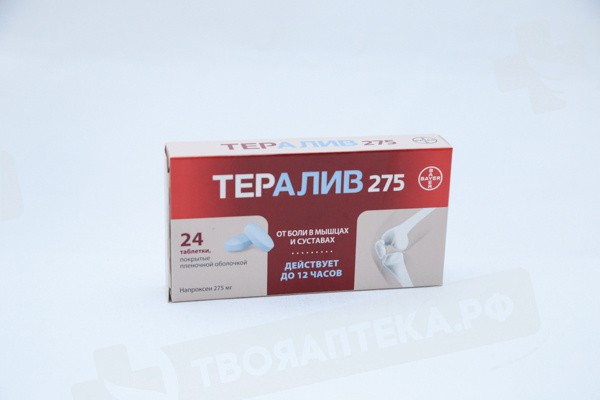 Фармакодииамика Препарат Тералив 275 представляет собой напроксен, обладает обезболивающим, жаропонижающим и противовоспалительным действием.