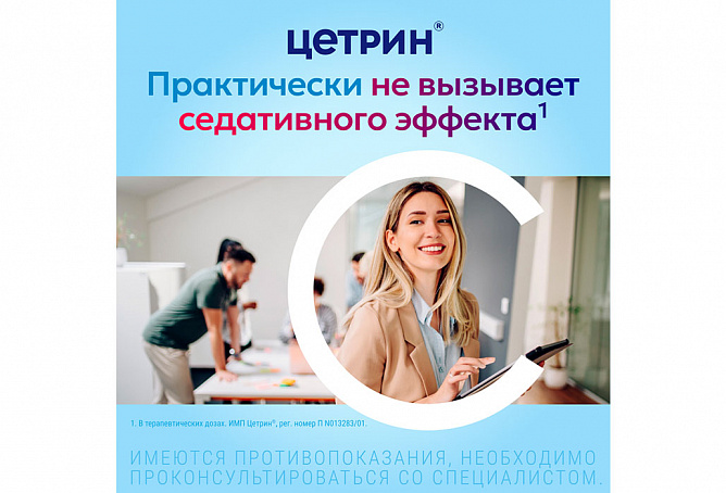 В терапевтических дозах практически не вызывает седативного эффекта. Начало эффекта после разового приема 10 мг цетиризина – 20 мин, продолжается более 24 ч. На фоне курсового лечения толерантность к антигистаминному действию цетиризина не развивается. После прекращения лечения действие сохраняется до 3 суток.