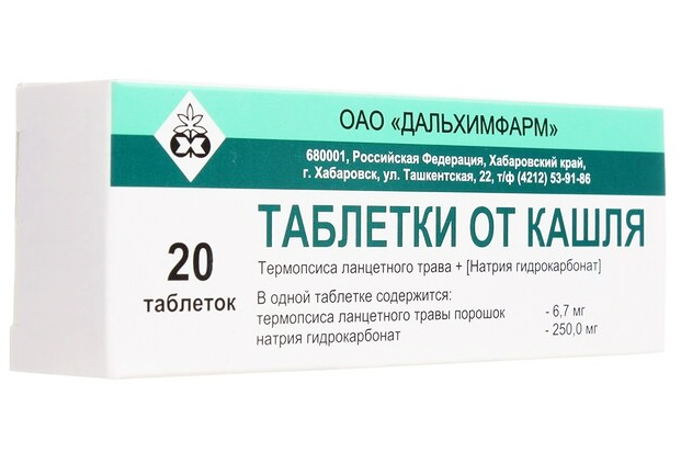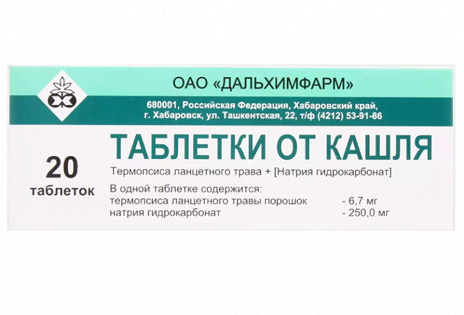 Действующие вещества: порошок травы термопсиса ланцетного - 6.7 мг, натрия гидрокарбонат - 250 мг.
