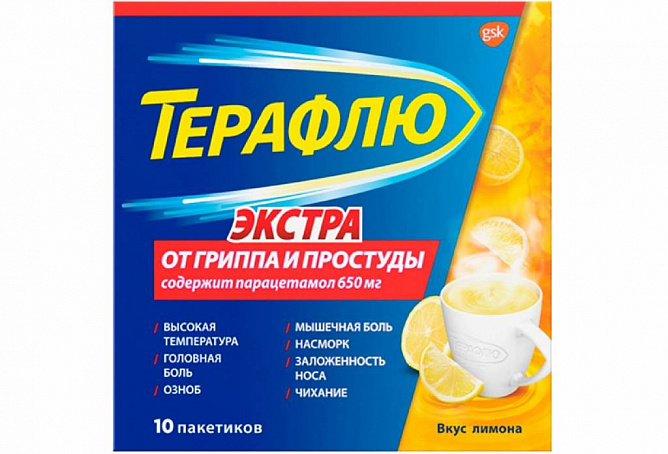 Порошок ТераФлю для приготовления раствора для приёма внутрь — это комбинация 3-х активных компонентов, направленных на комплексную борьбу с симптомами гриппа и простуды: