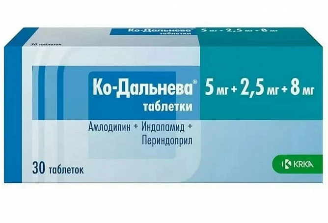 Ко-Дальнева - комбинированный препарат, содержащий периндоприла эрбумин (ингибитор АПФ), индапамид (тиазидоподобный диуретик) и амлодипин (блокатор медленных кальциевых каналов (БМКК)). Ко-Дальнева- сочетает в себе свойства каждого из действующих веществ, которые обладают при этом потенцирующим действием.