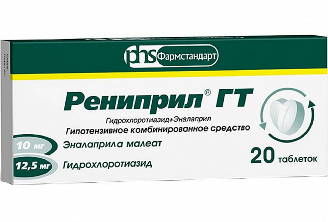 Комбинация гидрохлоротиазида и эналаприла B клинических исследованиях было показано, что применение комбинации гидрохлоротиазида и эналаприла приводит к более выраженному снижению АД в сравнении с монотерапией каждым из препаратов в отдельности и позволяет сохранять антигипертензивное действие препарата Рениприл®ГТ по меньшей мере в течение 24 часов. Эналаприл уменьшает потерю ионов калия, обусловленную применением гидрохлоротиазида.