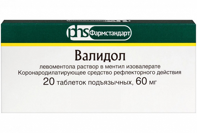 Действующее вещество: левоментола раствор в ментил изовалерате (валидол) - 60,0 мг;