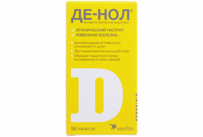 Де-нол 120 мг 56 шт. таблетки, покрытые пленочной оболочкой - это лекарственный препарат, противоязвенное средство с бактерицидной активностью в отношении Helicobacter pylori. Обладает также противовоспалительным и вяжущим действием. В кислой среде желудка осаждаются нерастворимые висмута оксихлорид и цитрат, образуются хелатные соединения с белковым субстратом в виде защитной пленки на поверхности язв и эрозий.