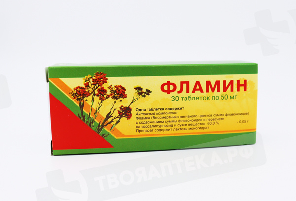 Активное вещество:фламина в пересчете на содержание суммы флавоноидов 70% и сухое вещество 50 мг;