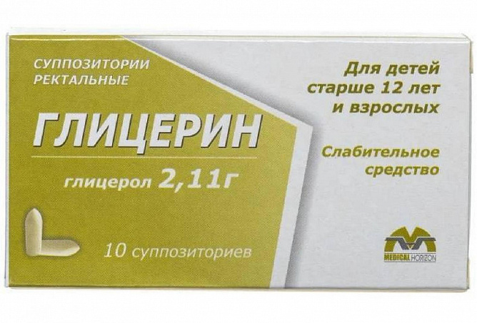 В 1 суппозитории содержится: Активные вещества: Глицерол (глицерин дистиллированный) — 2,11 в пересчете на 100%содержание глицерола (Вспомогательные вещества: Макрогол 400 (полиэтиленоксид 400) — 0,21 г Стеариновая кислота — 0,205 г Натрия карбоната декагидрат (натрий углекислый 10-водный) — 0,103 г