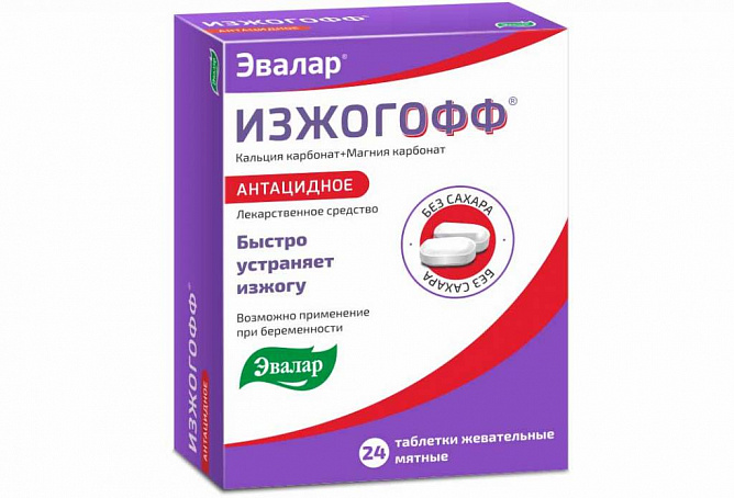 Таблетка ИЗЖОГОФФ содержит антацидные вещества кальция карбонат и магния карбонат, которые обеспечивают быструю и продолжительную нейтрализацию избыточной соляной кислоты желудочного сока, тем самым оказывая защитное действие на слизистую оболочку желудка.