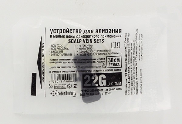 Игла катетер бабочка "SFM" -Устройство для кратковременной инфузии (вливаний в малые вены) со скоростью, потока не менее 11 мл/мин, остаточный объем не более 0.39 мл.,