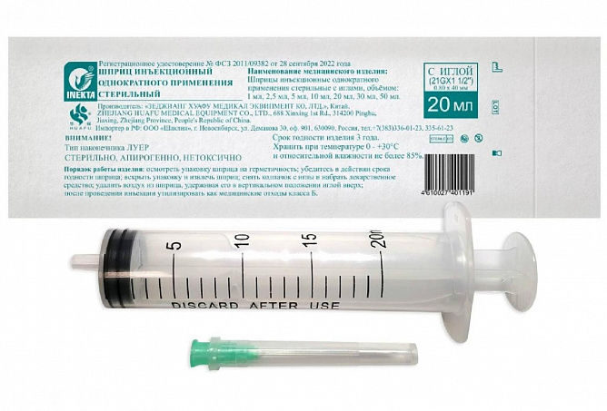 Шприц 3-х компонентный объемом 20 мл – это медицинское изделие, которое используется для инъекций. Шприц стерильный инъекционный имеет индивидуальную упаковку и предназначен для одноразового использования. Он выполнен из качественного и безопасного материала. Игла 21G (0,8х40мм) - съёмная. Игла при введении не травмирует ткани, за счёт покрытия специальной смазкой.