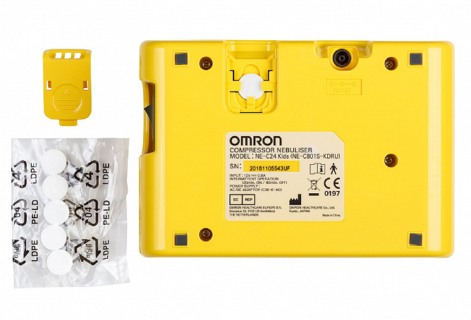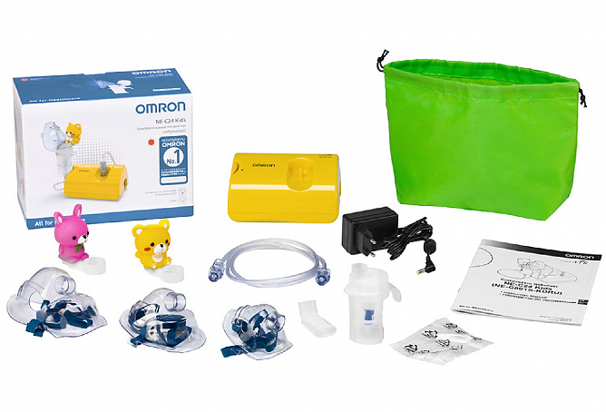 Компрессор, небулайзерная камера, детские аксессуары (веселый медвежонок, счастливый кролик), воздуховодная трубка (ПВХ, 100 см), запасные воздушные фильтры – 5 шт., загубник, маска для взрослых (ПВХ), маска для младенцев (ПВХ), маска для детей (ПВХ), адаптер переменного тока, сумка для хранения, руководство по эксплуатации, гарантийный талон.