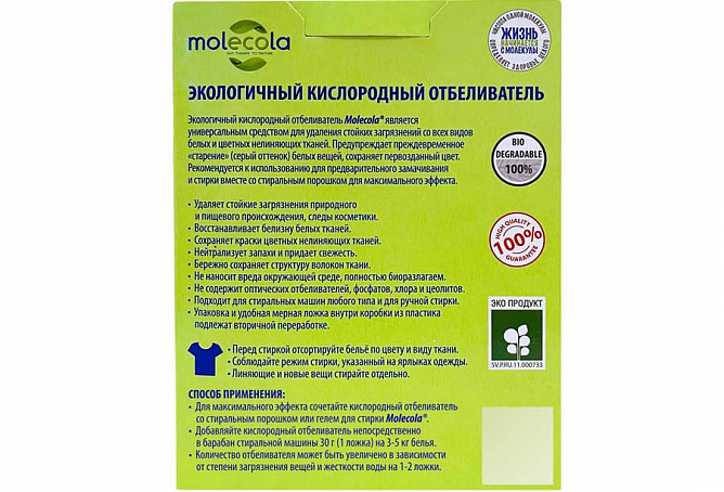 Экологичный кислородный отбеливатель является универсальным средством для удаления стойких загрязнений со всех видов белых и цветных нелиняющих тканей. Предупреждает преждевременное «старение» (серый оттенок) белых вещей и сохраняет краски цветных нелиняющих тканей. Удаляет стойкие загрязнения природного и пищевого происхождения, следы косметики. Рекомендуется к использованию для предварительного замачивания и стирки вместе со стиральным порошком для максимального эффекта.