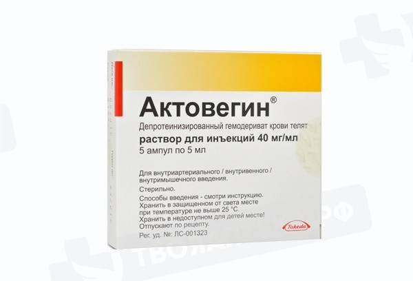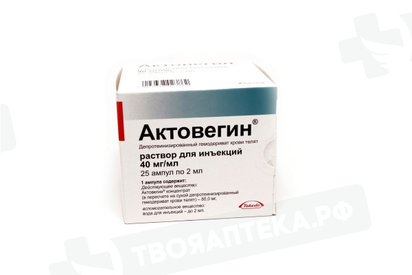 Фармакологическая группа: Регенерации тканей стимулятор. Фармакодинамика: Актовегин – антигипоксант, оказывающий три вида эффектов: метаболический, нейропротективный и микроциркуляторный. Актовегин повышает поглощение и утилизацию кислорода; входящие в состав препарата инозитол фосфо-олигосахариды положительно влияют на транспорт и утилизацию глюкозы, что приводит к улучшению энергетического метаболизма клеток и снижению образования лактата в условиях ишемии. Рассматривается несколько путей реализации нейропротективного механизма действия препарата. Актовегин препятствует развитию апоптоза, индуцированного пептидом бета-амилоида (Aбета25-35). Актовегин модулирует активность ядерного фактора каппа В (NF-kB), играющего важную роль в регуляции процессов апоптоза и воспаления в центральной и периферической нервной системе. Другой механизм действия связан с ядерным ферментом поли(АДФ-рибоза)-полимеразой (PARP). PARP играет важную роль в выявлении и репарации повреждений одноцепочечной ДНК, однако чрезмерная активация фермента может запускать процессы клеточной гибели при таких состояниях, как цереброваскулярные заболевания и диабетическая полинейропатия. Актовегин ингибирует активность PARP, что приводит к функциональному и морфологическому улучшению состояния центральной и периферической нервной системы. Положительными эффектами препарата Актовегин, влияющими на процессы микроциркуляции и на эндотелий, являются увеличение скорости капиллярного кровотока, уменьшение перикапиллярной зоны, снижение миогенного тонуса прекапиллярных артериол и капиллярных сфинктеров, снижение степени артериоловенулярного шунтирующего кровотока с преимущественной циркуляцией крови в капиллярном русле и стимуляция функции эндотелиальной синтазы оксида азота, влияющей на микроциркуляторное русло. В ходе различных исследований было установлено, что эффект препарата Актовегин наступает не позднее, чем через 30 минут после его приема. Максимальный эффект отмечается через 3 часа после парентерального и через 2–6 часов после перорального применения.