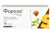 Всасывание Биодоступность алендроновой кислоты у женщин при приеме внутрь натощак не позднее, чем за 2 часа до завтрака в дозе 70 мг составляет 0,64%; у мужчин она составляет 0,6%. При приеме за 30-60 мин до еды биодоступность снижается на 40% по сравнению с дозой, принятой за 2 ч перед едой. Биодоступность алендроновой кислоты значительно снижается, если препарат принимается менее чем за 30 минут до приема пищи или жидкости, биодоступность минимальна при приеме вместе с пищей или в течение двух часов после еды. Совместный прием алендроновой кислоты с кофе или апельсиновым соком снижает ее биодоступность приблизительно на 60%. Распределение Средний объем распределения алендроновой кислоты в равновесном состоянии (за исключением костной ткани) составляет, по меньшей мере, 28 л. При приеме терапевтических доз концентрация алендроновой кислоты в плазме крови незначительна (менее 5 нг/мл). Связывание алендроновой кислоты с белками плазмы составляет приблизительно 78%. Метаболизм Нет подтверждений того, что алендроновая кислота подвергается метаболизму в организме человека или животных. Выведение После однократного внутривенного введения алендроновой кислоты, меченной атомами углерода 14С, приблизительно 50% выводится почками в течение 72 часов; выведение меченого вещества с калом не определялось или было незначительным. После однократного внутривенного введения 10 мг алендроновой кислоты ее почечный клиренс составлял 71 мл/мин, а системный клиренс не превышал 200 мл/мин. Через 6 часов после внутривенного введения концентрация в плазме крови снижается более чем на 95%. Конечный период полувыведения превышает 10 лет, что отражает высвобождение алендроновой кислоты из костной ткани. Алендроновая кислота выводится почками. Несколько большее накопление алендроновой кислоты в костной ткани можно ожидать у пациентов с нарушением функции почек. Фармакокинетика у особых групп пациентов Пол Биодоступность алендроновой кислоты существенно не отличается у мужчин и женщин. Раса Фармакокинетические различия по расовому признаку не были изучены. Пациенты пожилого возраста Биодоступность и выведение алендроновой кислоты сходны у пожилых и молодых пациентов. Пациенты с нарушением функции печени У пациентов с нарушением функции печени нет необходимости корректировать дозу алендроновой кислоты, поскольку она не метаболизируется и не выводится с желчью. Пациенты с нарушением функции почек У здоровых добровольцев алендроновая кислота, не накапливающаяся в костной ткани, быстро выводится с мочой. Контролируемых фармакокинетических исследований по применению алендроновой кислоты при почечной недостаточности нет, но у пациентов с выраженным нарушением функции почек выведение алендроновой кислоты будет снижено. Поэтому можно ожидать несколько большее накопление алендроновой кислоты в костной ткани у пациентов с нарушением функции почек. При клиренсе креатинина от 35 до 60 мл/мин коррекции дозы не требуется. Применять алендроновую кислоту у пациентов с клиренсом креатинина менее 35 мл/мин не рекомендуется в связи с отсутствием опыта применения.