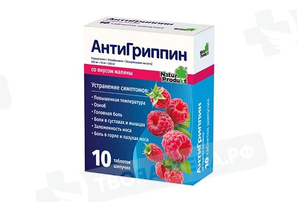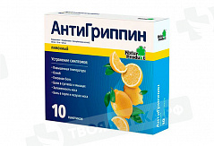 АнтиГриппин от Натур Продукт - комбинированный препарат для лечения инфекционно-воспалительных заболеваний (ОРВИ, грипп), сопровождающихся повышенной температурой, ознобом, головной болью, болями в суставах и мышцах, заложенностью носа и болями в горле и пазухах носа, и применяемый для взрослых и детей с 3-х лет.