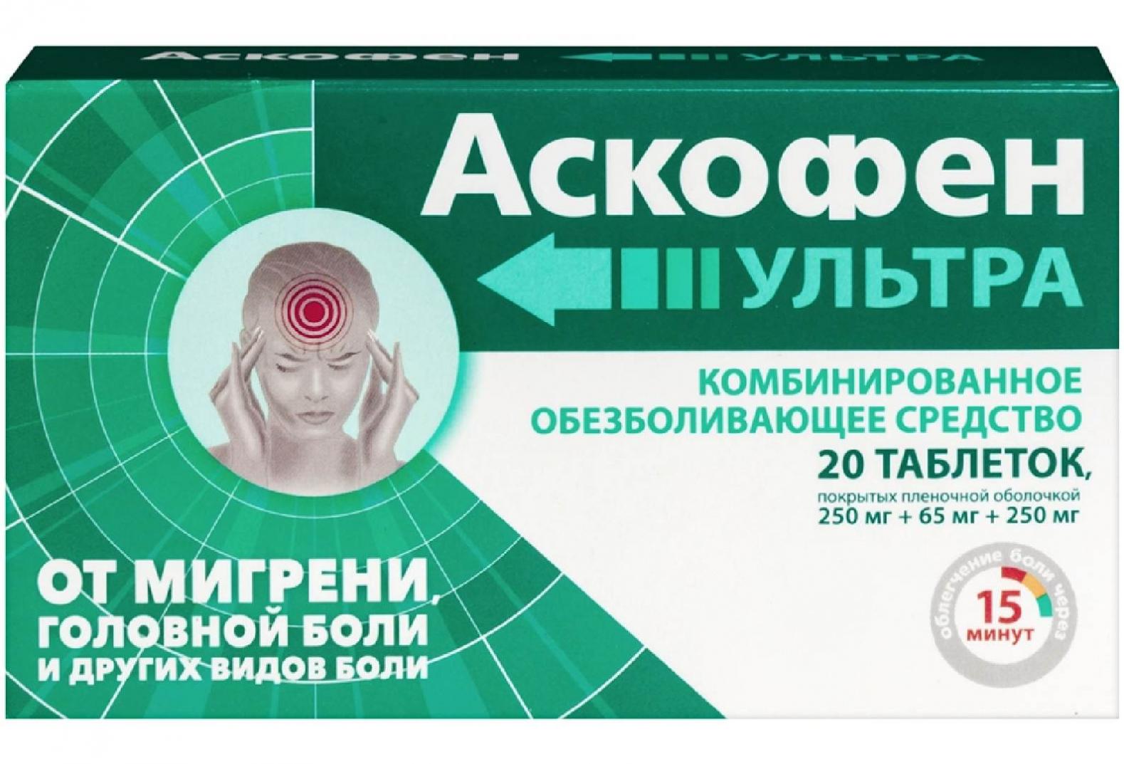 Аскофен® Ультра — новый анальгетик с доказанным международными исследованиями действием комбинации против мигрени, головной боли и других видов боли. С заботой о Вас в борьбе с болью. Доказанное многочисленными масштабными исследованиями действие комбинации «парацетамол 250 мг + ацетилсалициловая кислота 250 мг + кофеин 65 мг» против головной боли и мигрени — более 30 лет исследований. Преимущества препарата Аскофен® Ультра Подходит в качестве комбинированной терапии при тяжелых приступах мигрени Подходит для начальной стадии терапии мигрени Имеет преимущество перед ибупрофеном в купировании болевого синдрома согласно исследованиям Способствует началу развития облегчения головной и других видов боли уже через 15 минут при приеме 2 таблеток. Преимущества формы выпуска Таблетки в пленочной оболочке удобнее проглатывать, обеспечивается лучшая стабильность действующих веществ. Используемые источники предоставленной информации: -Goldstein J, Hagen M2, Gold M. Results of a multicenter, double-blind, randomized, parallel-group, placebo-controlled, single-dose study comparing the fixed combination of acetaminophen, acetylsalicylic acid, and caffeine with ibuprofen for acute treatment of patients with severe migraine (Результаты многоцентрового, двойного слепого, рандомизированного, параллельного группового, плацебо-контролируемого, однократного исследования по сравнению фиксированной комбинации парацетамола, ацетилсалициловой кислоты и кофеина с ибупрофеном для лечения острых тяжелых приступов мигрени). Cephalalgia. 2014 Nov;34(13):1070-8. [PubMed]; -American Headache Society (Американское сообщество по лечению головной боли) The American Headache Society Position Statement On Integrating New Migraine Treatments Into Clinical Practice (Заявление о позиции Американского сообщества по лечению головной боли в отношении внедрения нового лечения мигрени в клиническую практику) // Headache: The Journal of Head and Face Pain. 2018. № 1 (59). C. head.13456; -Goldstein J, Hagen M2, Gold M. Results of a multicenter, double-blind, randomized, parallel-group, placebo-controlled, single-dose study comparing the fixed combination of acetaminophen, acetylsalicylic acid, and caffeine with ibuprofen for acute treatment of patients with severe migraine (Результаты многоцентрового, двойного слепого, рандомизированного, параллельного группового, плацебо-контролируемого, однократного исследования по сравнению фиксированной комбинации парацетамола, ацетилсалициловой кислоты и кофеина с ибупрофеном для лечения острых тяжелых приступов мигрени). Cephalalgia. 2014 Nov;34 (13):1070-8; -инструкция по медицинскому применению