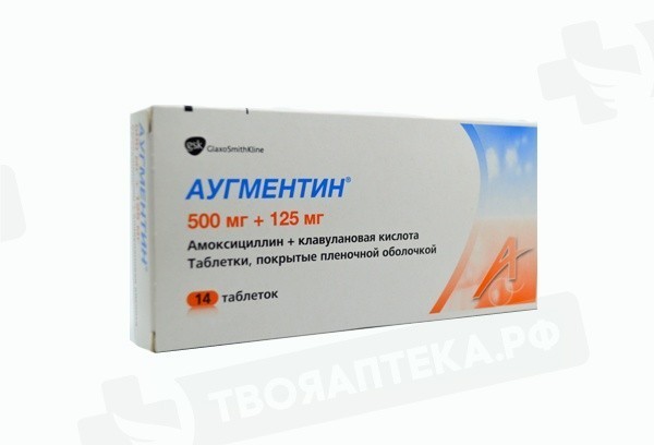 Всасывание Оба действующих вещества препарата Аугментин®, амоксициллин и клавулановая кислота, быстро и полностью всасываются при приеме внутрь. Всасывание действующих веществ препарата Аугментин® оптимально в случае приема препарата в начале приема пищи. При применении препарата Аугментин® концентрация амоксициллина в сыворотке крови сходна с таковой при пероральном приеме эквивалентных доз при монотерапии амоксициллином. Распределение: При внутривенном введении амоксициллин и клавулановая кислота обнаруживаются в терапевтических концентрациях в различных тканях и интерстициальной жидкости (в желчном пузыре, тканях брюшной полости, коже, жировой и мышечной тканях, синовиальной и перитонеальной жидкостях, желчи, гнойном отделяемом). Амоксициллин и клавулановая кислота не обладают высокой степенью связывания с белками сыворотки крови. Проведенные исследования показали, что с белками сыворотки крови связывается около 25 % общего количества клавулановой кислоты и 18 % амоксициллина в сыворотке крови. В исследованиях на животных не было обнаружено накопление компонентов препарата в каком-либо органе. Амоксициллин, как и большинство пенициллинов, проникает в грудное молоко. В грудном молоке могут быть обнаружены также следовые количества клавулановой кислоты (см. раздел «Применение при беременности и в период грудного вскармливания»). Исследования репродуктивной функции у животных показали, что амоксициллин и клавулановая кислота проникают через плацентарный барьер (см. раздел «Применение при беременности и в период грудного вскармливания»). Метаболизм: Амоксициллин частично выводится почками в виде неактивной пенициллойной кислоты в количестве, эквивалентном 10-25 % от первоначальной дозы. Клавулановая кислота подвергается интенсивному метаболизму у человека до 2,5-дигидро-4- (2-гидроксиэтил)-5-оксо-1Н-пиррол-3-карбоновой кислоты и 1-амино-4-гидрокси-бутан-2- она и выводится почками, через желудочно-кишечный тракт, а также в виде диоксида углерода с выдыхаемым воздухом. Выведение: Как и другие пенициллины, амоксициллин выводится в основном почками, тогда как клавулановая кислота — посредством как почечного, так и внепочечного механизмов. Примерно 60-70 % амоксициллина и около 40-65 % клавулановой кислоты выводится почками в неизмененном виде в первые 6 часов после применения 1 таблетки препарата Аугментин®, таблетки, покрытые пленочной оболочкой, 250 мг + 125 мг или 500 мг + 125 мг. Одновременное применение пробенецида замедляет выведение амоксициллина, но не замедляет выведение клавулановой кислоты почками.