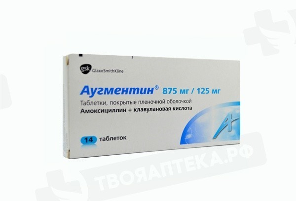 Для приема внутрь. Режим дозирования устанавливается индивидуально в зависимости от возраста, массы тела, функции почек пациента, а также от степени тяжести инфекции. Для снижения потенциально возможных нарушений со стороны желудочно-кишечного тракта и оптимизации всасывания действующих веществ препарат Аугментин® следует принимать в начале приема пищи. Лечение не должно продолжаться более 14 суток без пересмотра клинической ситуации. Минимальный курс антибактериальной терапии составляет 5 дней. При необходимости возможно проведение ступенчатой терапии (вначале внутривенное введение комбинации амоксициллина с клавулановой кислотой с последующим переходом на комбинацию амоксициллина с клавулановой кислотой в лекарственных формах для перорального применения). Взрослые и дети от 12 лет и старше или с массой тела 40 кг и более: По 1 таблетке 875 мг +125 мг 2 раза в сутки. Дети младше 12 лет с массой тела менее 40 кг Рекомендуется использовать другие лекарственные формы препарата Аугментин®. Пациенты пожилого возраста: Не требуется коррекция режима дозирования. У пожилых пациентов с нарушениями функции почек дозу следует корректировать так, как это указано ниже для взрослых с нарушениями функции почек. Пациенты с нарушением функции почек: Таблетки 875 мг + 125 мг следует применять только у пациентов с клиренсом креатинина более 30 мл/мин, при этом коррекция режима дозирования не требуется. В большинстве случаев по возможности следует отдавать предпочтение парентеральной терапии. Пациенты с нарушением функции печени: Лечение проводят с осторожностью; регулярно осуществляют мониторинг функции печени. Недостаточно данных для изменения в рекомендации режима дозирования у таких пациентов.