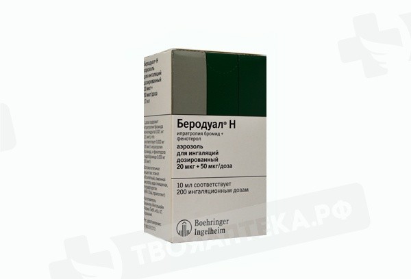 Фармакологическая группа: Бронходилатирующее средство комбинированное (бета2- адреномиметик селективный + М-холиноблокатор. Фармакодинамика: БЕРОДУАЛ Н содержит два компонента, обладающих бронхолитической активностью: ипратропия бромид - М-холиноблокатор, и фенотерола гидробромид - бета2-адреномиметик. Бронходилатация при ингаляционном введении ипратропия бромида обусловлена главным образом местным, а не системным антихолинергическим действием. Ипратропия бромид является четвертичным соединением аммония, обладающим антихолинергическими (парасимпатолитическими) свойствами. Ипратропия бромид тормозит рефлексы, вызываемые блуждающим нервом. Антихолинергические средства предотвращают повышение внутриклеточной концентрации Ca2+, что происходит вследствие взаимодействия ацетилхолина с мускариновым рецептором, расположенным на гладких мышцах бронхов. Высвобождение Ca2+ опосредуется системой вторичных медиаторов, в число которых входят ИТФ (инозитола трифосфат) и ДАГ (диацилглицерин). У пациентов с бронхоспазмом, связанным с хроническими обструктивными заболеваниями легких (хронический бронхит и эмфизема легких), значительное улучшение функции легких (увеличение объема форсированного выдоха за 1 сек (ОФВ1) и пиковой скорости выдоха на 15 % и более) отмечено в течение 15 минут, максимальный эффект достигался через 1-2 часа и продолжался у большинства пациентов до 6 часов после введения. Ипратропия бромид не оказывает отрицательного влияния на секрецию слизи в дыхательных путях, мукоцилиарный клиренс и газообмен. Фенотерола гидробромид избирательно стимулирует бета2-адренорецепторы в терапевтической дозе. Стимуляция бета2-адренорецепторов активирует аденилатциклазу через стимуляцию Gs- белка. Стимуляция бета1-адренорецепторов происходит при использовании высоких доз. Фенотерола гидробромид расслабляет гладкую мускулатуру бронхов и сосудов и противодействует развитию бронхоспастических реакций, обусловленных влиянием гистамина, метахолина, холодного воздуха и аллергенов (реакции гиперчувствительности немедленного типа). Сразу после введения фенотерол блокирует высвобождение медиаторов воспаления и бронхообструкции из тучных клеток. Кроме того, при использовании фенотерола в дозах 0,6 мг, отмечалось усиление мукоцилиарного клиренса. бета-адренергическое влияние препарата на сердечную деятельность, такое как увеличение частоты и силы сердечных сокращений, обусловлено сосудистым действием фенотерола, стимуляцией бета2-адренорецепторов сердца, а при использовании доз, превышающих терапевтические, стимуляцией бета1-адренорецепторов. Как и при использовании других бета- адренергических препаратов отмечалось удлинение интервала QTс при использовании высоких доз. При использовании фенотерола с помощью дозированных аэрозольных ингаляторов (ДАИ) этот эффект был непостоянным и отмечался в случае применения доз, превышавших рекомендуемые. Однако после применения фенотерола с помощью небулайзеров (раствор для ингаляций во флаконах со стандартной дозой) системное воздействие может быть выше, чем при использовании препарата с помощью ДАИ в рекомендуемых дозах. Клиническое значение этих наблюдений не установлено. Наиболее часто наблюдаемым эффектом агонистов бета-адренорецепторов является тремор. В отли