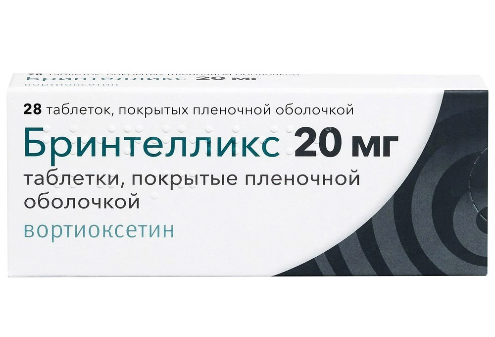 Бринтелликс предназначен для приема внутрь. Покрытые пленочной оболочкой таблетки можно принимать вне зависимости от приема пищи. Начальная и рекомендуемая доза Бринтелликса у взрослых пациентов младше 65 лет составляет 10 мг однократно в сутки. В зависимости от индивидуальной реакции пациента суточная доза может быть увеличена до максимальной дозы 20 мг вортиоксетина один раз в сутки или снижена до минимальной дозы 5 мг вортиоксетина один раз в сутки. После полного разрешения симптомов депрессии рекомендовано продолжать лечение в течение, по крайней мере, 6 месяцев для закрепления антидепрессивного эффекта. Прекращение лечения Пациенты, получающие лечение вортиоксетином, могут одномоментно прекратить прием лекарственного препарата без необходимости постепенного понижения дозы (см. раздел «Фармакологические свойства»). Пожилые пациенты У пациентов старше 65 лет в качестве начальной дозы всегда следует использовать минимальную эффективную дозу Бринтелликса 5 мг однократно в сутки. Необходимо соблюдать осторожность при лечении пациентов старше 65 лет с применением доз выше 10 мг вортиоксетина однократно в сутки, так как данные о применении препарата у этой группы пациентов ограничены (см. раздел «Особые указания»). Ингибиторы цитохрома P450: В зависимости от индивидуальной реакции пациента может потребоваться снижение дозы Бринтелликса в случае присоединения терапии сильными ингибиторами изофермента CYP2D6 (например, бупропионом, хинидином, флуоксетином, пароксетином) (см. раздел «Взаимодействие с другими лекарственными средствами»). Индукторы цитохрома P450: В зависимости от индивидуальной реакции пациента может потребоваться коррекция дозы Бринтелликса в случае присоединения терапии индукторами цитохрома P450 широкого спектра (например, рифампицином, карбамазепином, фенитоином) (см. раздел «Взаимодействие с другими лекарственными средствами»). Дети и подростки Безопасность и эффективность препарата Бринтелликс у детей и подростков в возрасте до 18 лет не установлена. Данных по этой группе пациентов нет (см. раздел «Особые указания»). Нарушение функции почек или печени Коррекция дозы в зависимости от функции почек или печени не требуется (см. разделы «Особые указания» и «Фармакологические свойства»).