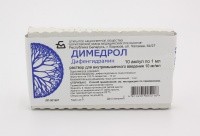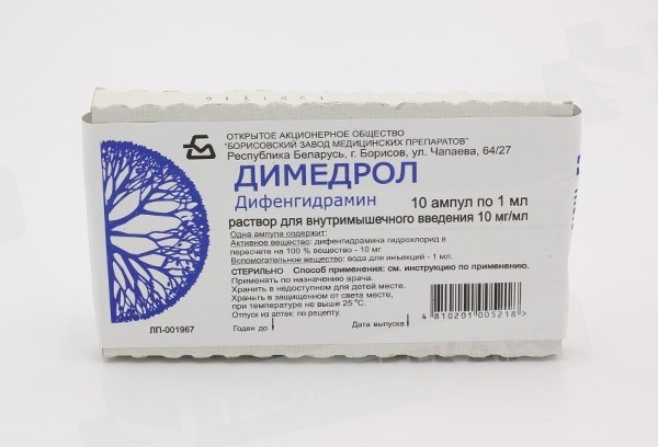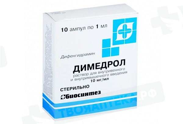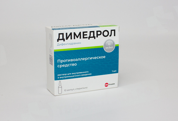 Внутривенно или внутримышечно. Для взрослых и детей старше 14 лет внутривенно или внутримышечно 1-5 мл раствора (10-50 мг) 1-3 раза в день. Максимальная суточная доза составляет 200 мг. Для детей в возрасте от 7 месяцев до 12 месяцев по 0,3-0,5 мл (3-5 мг), от 1 года до 3 лет по 0,5-1 мл (5-10 мг), от 4 до 6 лет по 1-1,5 мл (10-15 мг), от 7 до 14 лет по 1,5-3 мл (15-30 мг) при необходимости каждые 6-8 часов. Димедрол в инъекционной форме показан тогда, когда пероральное введение является нецелесообразным. Парентеральная лекарственная форма должна быть проверена визуально на наличие твердых частиц и обесцвечивание до применения всякий раз, когда вскрывают упаковку. Дозировка должна быть индивидуализирована в соответствии с потребностями и ответом пациента.
